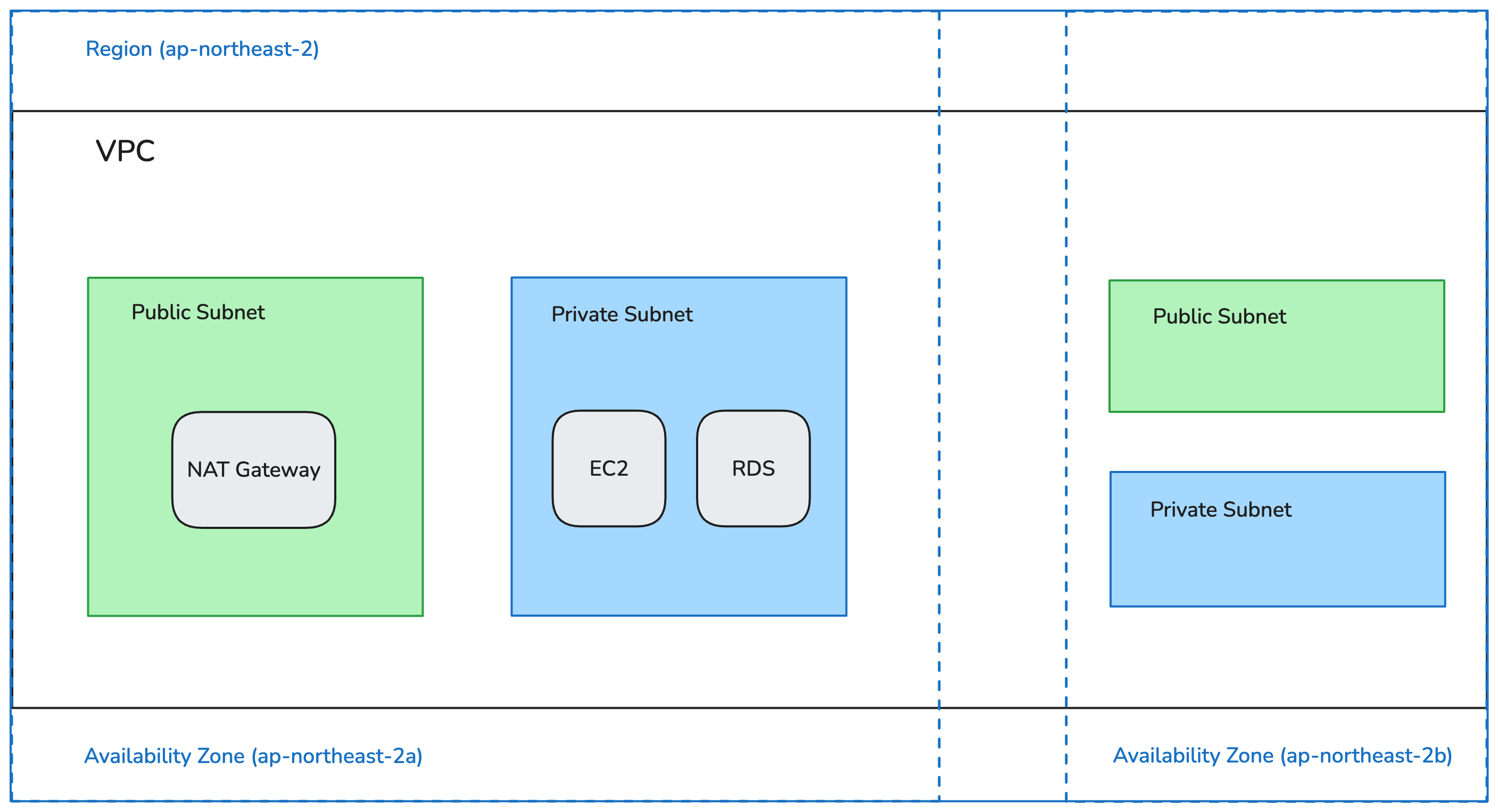 - 가용 영역(AZ) 2개 구성: 고가용성을 위해 서울 리전의 두 개의 다른 데이터 센터(AZ)에 걸쳐 네트워크를 구성했다. 하나의 AZ에 문제가 생겨도 다른 AZ에서 서비스를 운영할 수 있는 기반을 마련한 것이다.