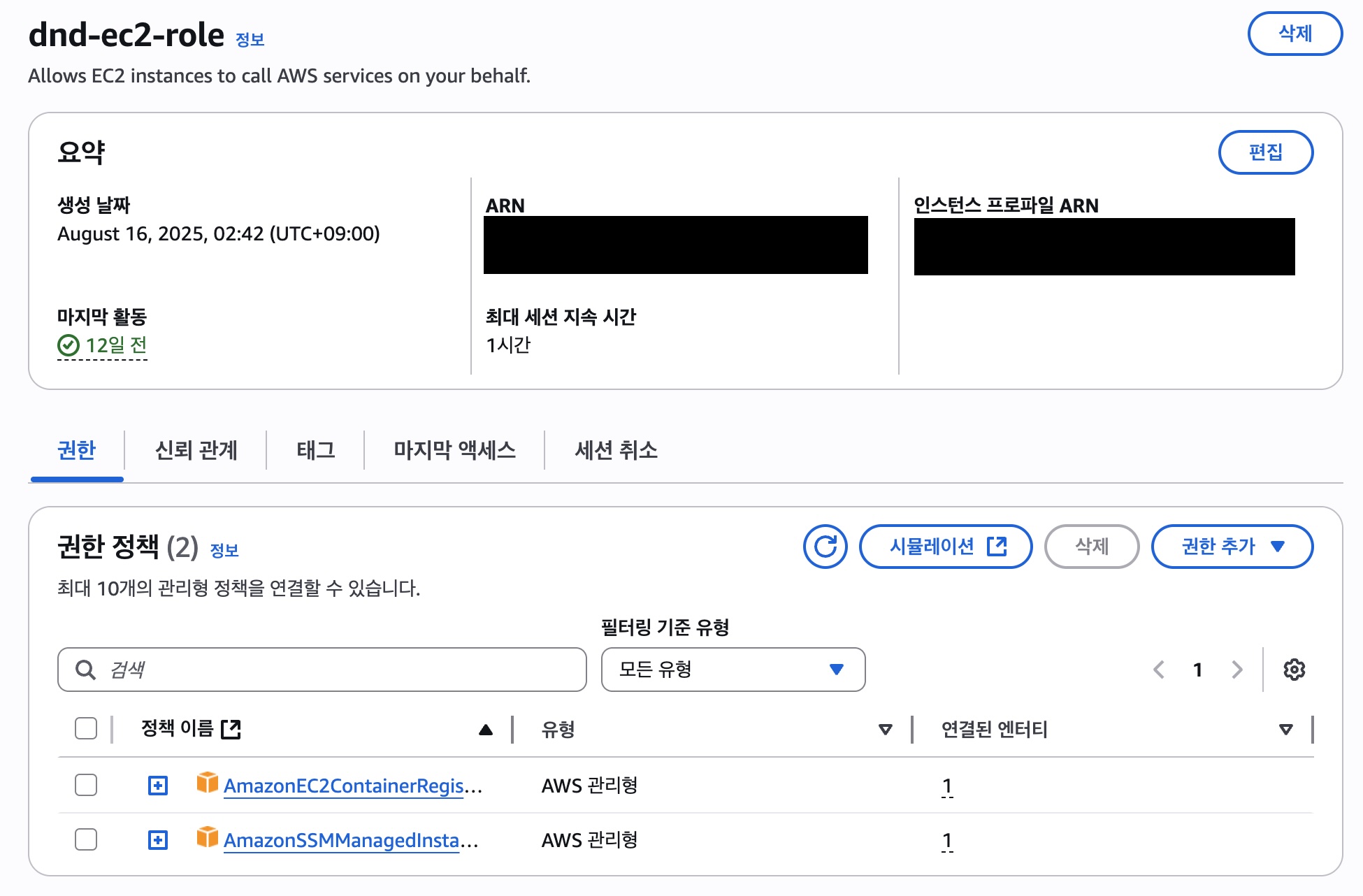 그룹을 나누었다. 이를 통해 사람의 실수로 인한 리스크를 줄이고자 했다.EC2를 위한 IAM 역할: EC2 인스턴스에 Access Key를 하드코딩하는 대신, IAM 역할을 부여했다. 이 역할 덕분에 EC2는 키 정보 없이도 ECR에서 Docker 이미지를 가져오는 등 필요한 권한을 안전하게 위임받을 수 있었다.