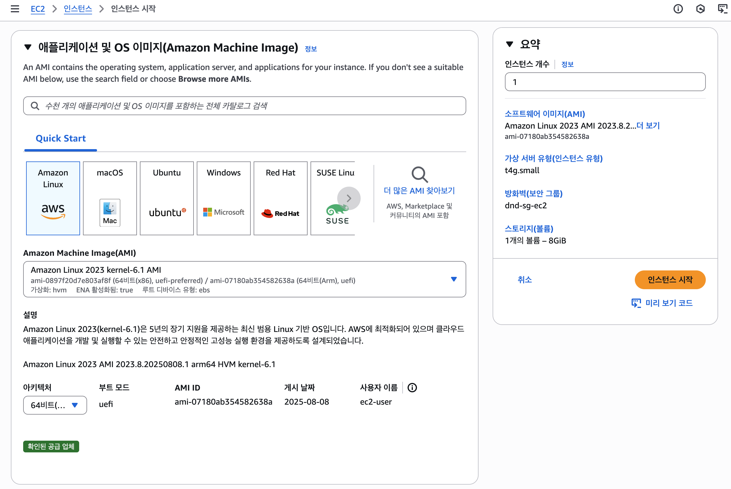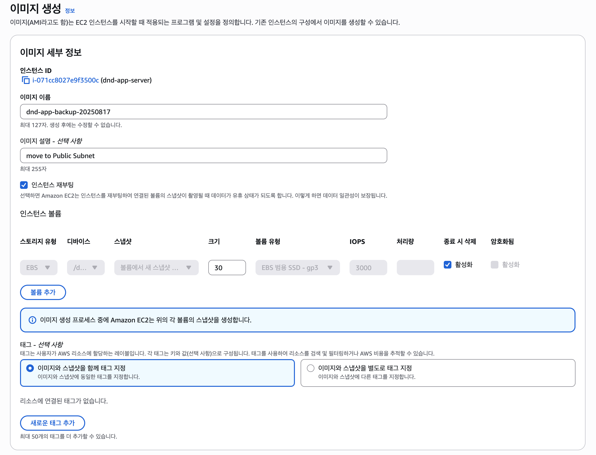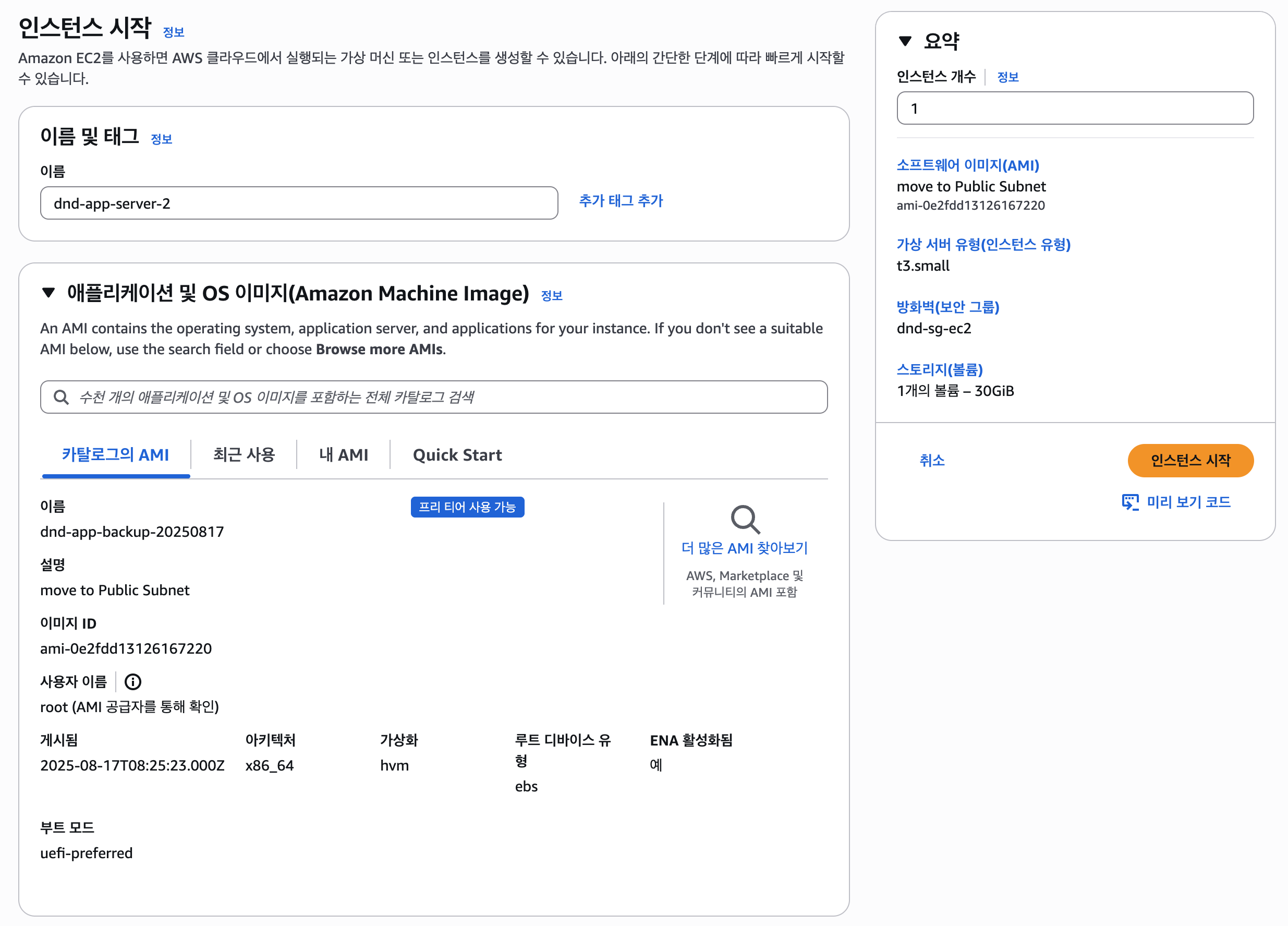 AMI를 이용한 서버 복제: 가장 먼저 기존 EC2의 환경을 그대로 보존하기 위해 AMI(Amazon Machine Image)로 스냅샷을 생성했다. 그리고 이 AMI를 사용해 Public Subnet에 동일한 환경의 새 EC2 인스턴스를 복제했다.