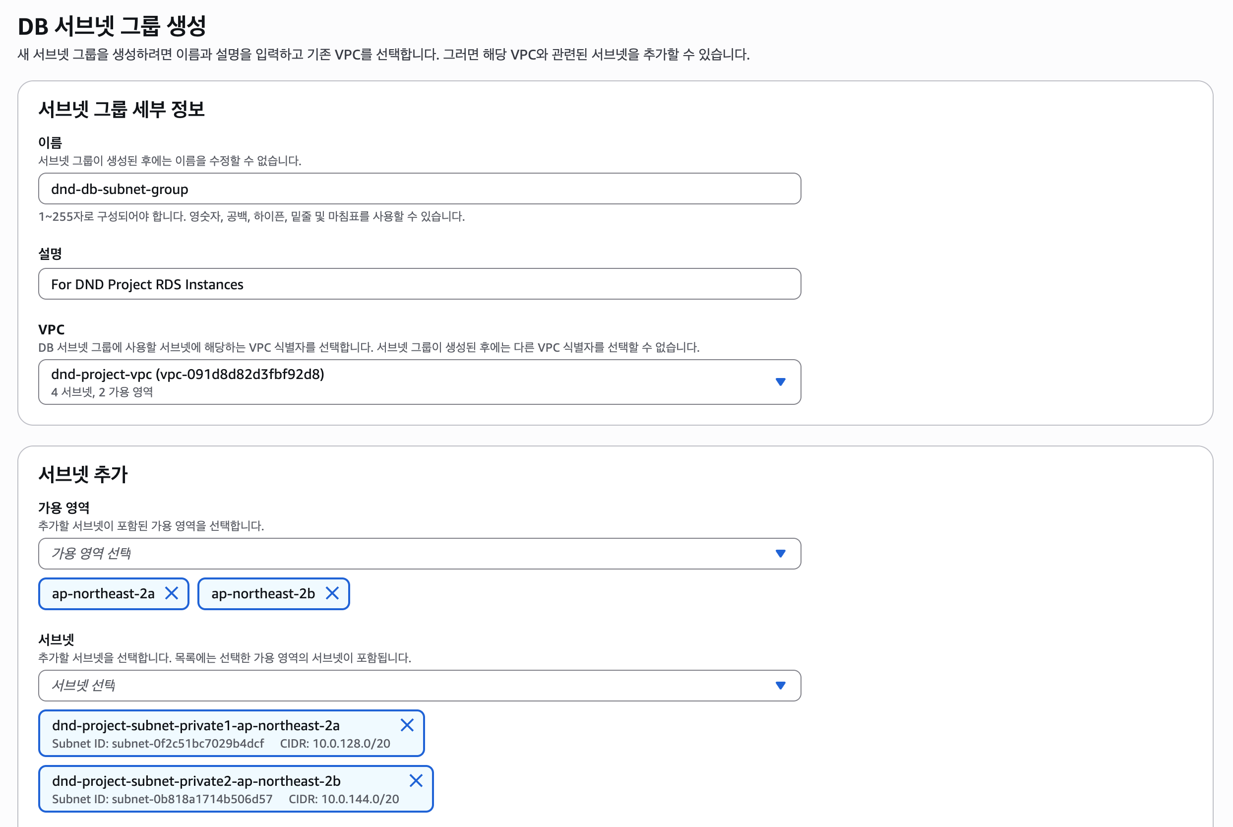 - Public/Private 서브넷 분리: 각 AZ마다 외부와 통신하는 Public Subnet과 내부망 역할을 하는 Private Subnet을 하나씩 생성했다. 보안이 중요한 EC2와 RDS는 모두 Private Subnet에 배치할 계획이었다.