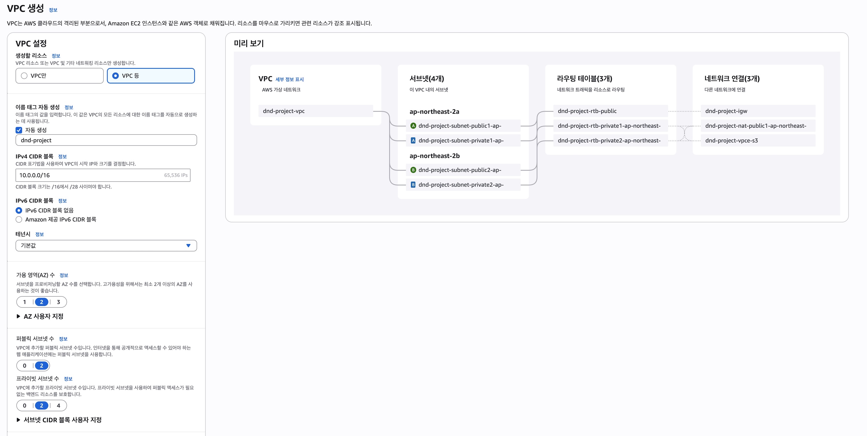 가장 먼저 VPC 생성 마법사를 이용해 격리된 네트워크를 구축했다.