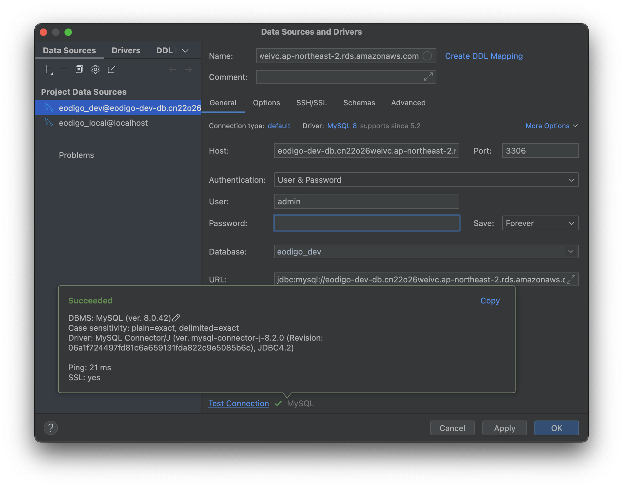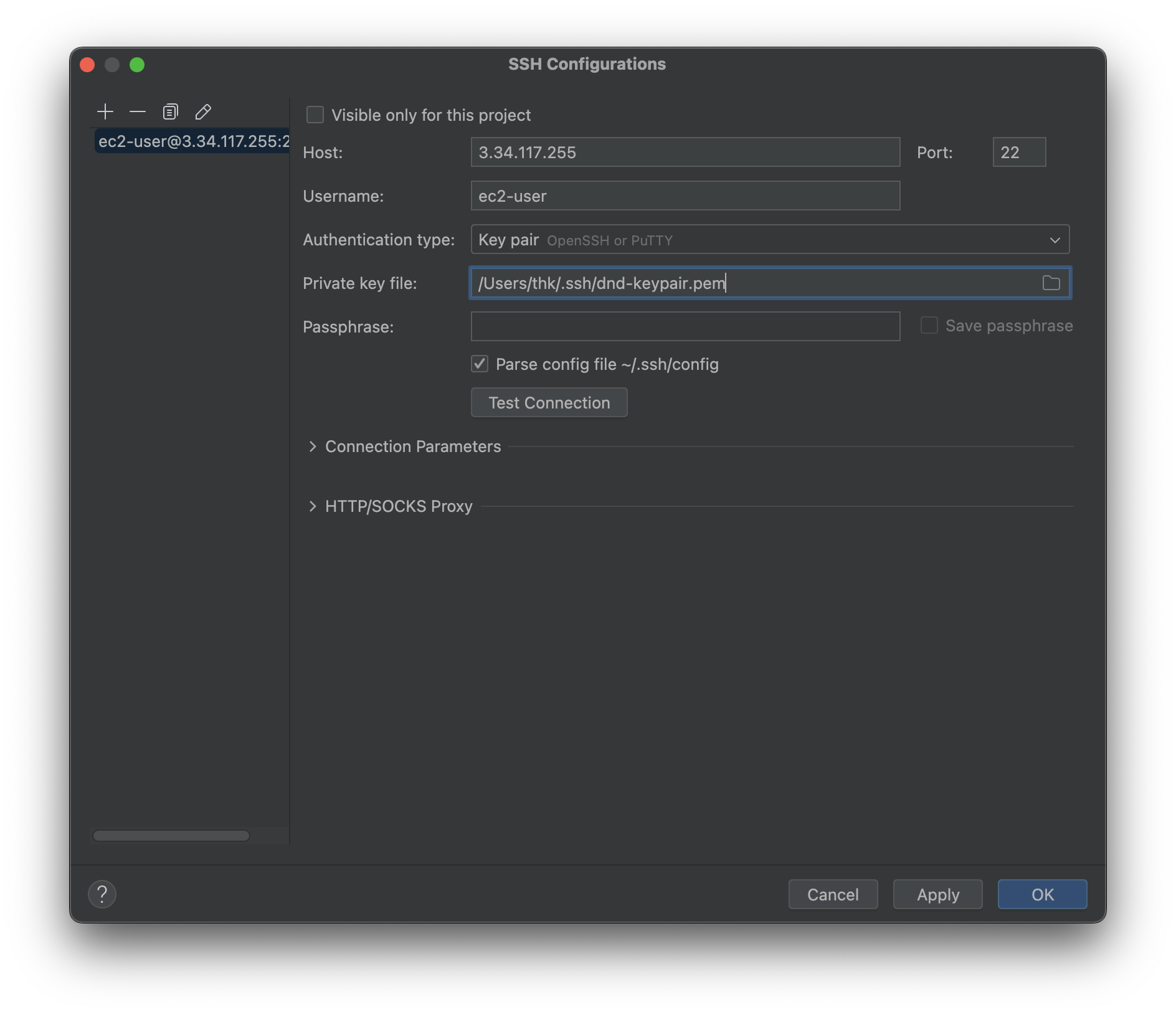 나는 주로 사용하는 DB 클라이언트인 DataGrip의 내장 SSH/SSL 터널링 기능을 활용했다. Proxy host에 Public EC2의 탄력적 IP를, Key-pair에