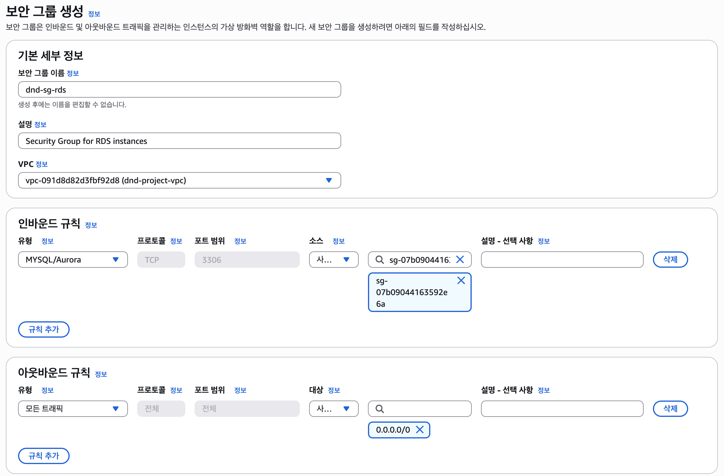 (RDS용) 두 개를 만들어 서로 다른 규칙을 적용했다. 특히 RDS 보안 그룹의 인바운드 규칙에는 IP 주소가 아닌, EC2의 보안 그룹 ID를 소스(Source)로 지정했다. 이는 오직 내 EC2 인스턴스만이 데이터베이스에 접근할 수 있도록 강제하는 설정이다.