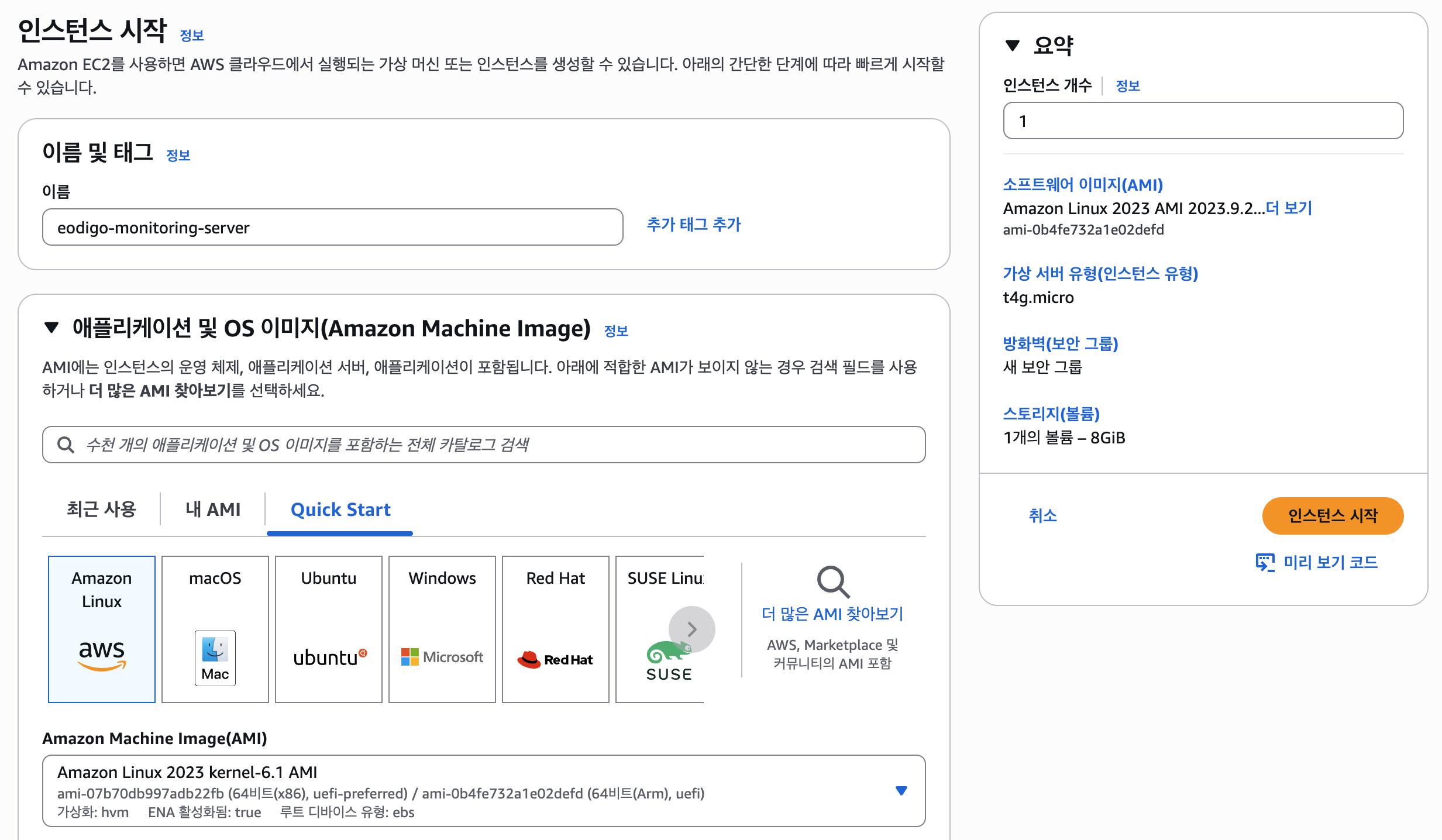 가장 먼저 Prometheus와 Grafana가 설치될 전용 서버를 생성했다. 인스턴스는 t4g.micro를 선택하여 비용을 최소화했다.