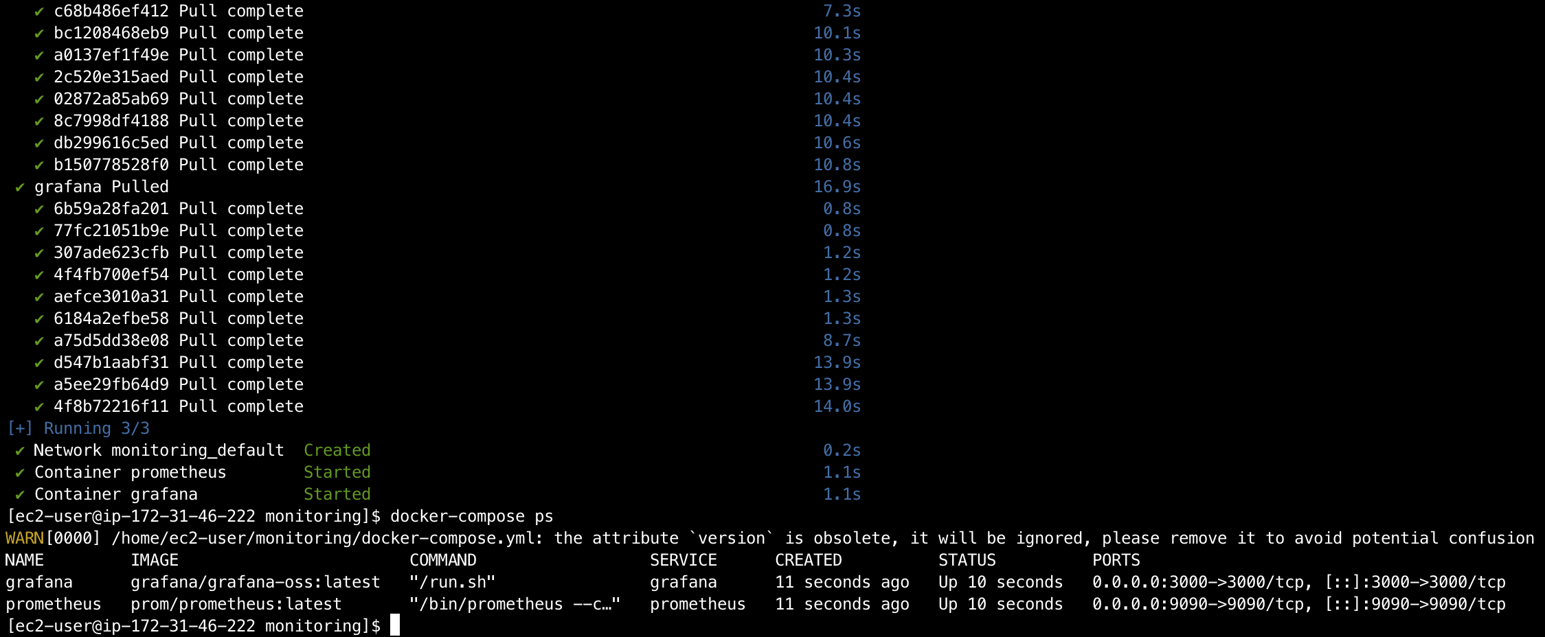 이제 준비된 Docker 환경 위에 Prometheus와 Grafana를 컨테이너로 실행할 차례다. 각 애플리케이션을 개별적으로 설치하고 관리하는 것은 번거롭기 때문에, docker-compose.yml 파일을 작성하여 두 서비스를 한번에 정의하고 실행했다.