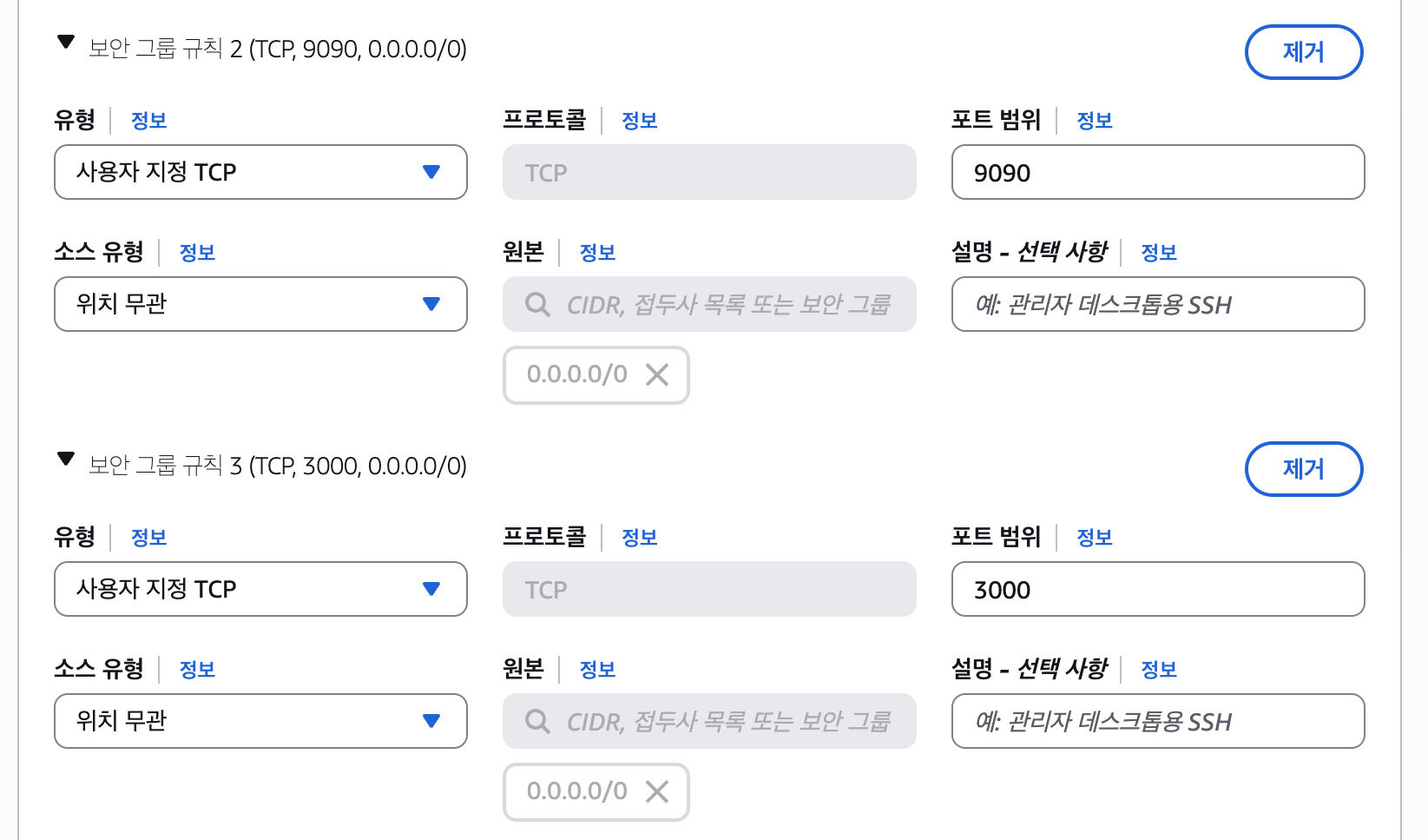 서버 생성 시 가장 중요한 것은 보안 그룹 설정이다. 외부에서 Prometheus와 Grafana 대시보드에 접근할 수 있도록 각각의 기본 포트인 9090과 3000번 포트를 인바운드 규칙에 추가했다. (SSH 접속을 위한 22번 포트 포함)