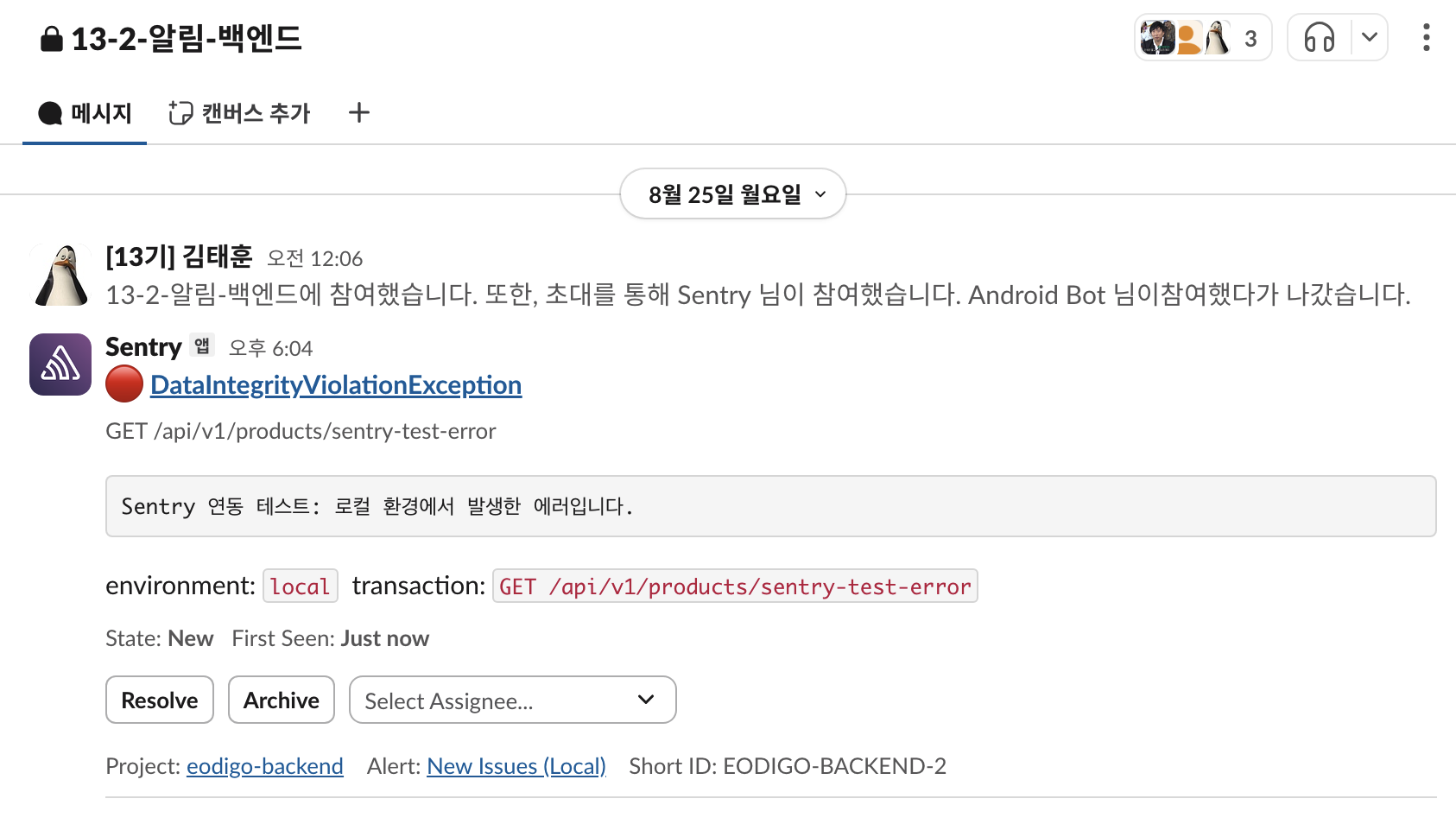 메서드에서 처리되지 않은 예외가 발생하면 Sentry SDK가 이를 감지한다. 감지된 에러는 Sentry 대시보드에 이슈로 등록되고, 앞서 설정한 규칙에 따라 Slack 채널로 즉시 알림이 전송된다.