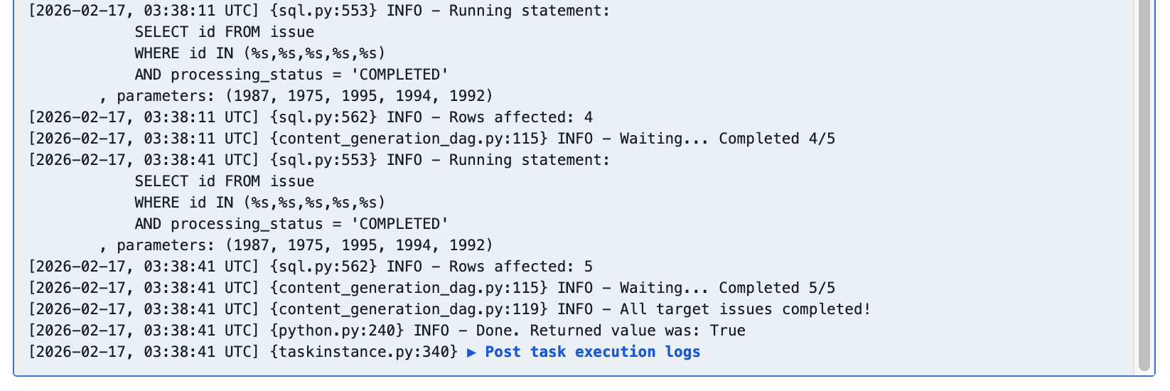SqlSensor를 제거하고,PythonOperator를 활용해 파이썬 기반의 커스텀 폴링 로직(wait_for_completion)을 구현했다. - 명확한 지시: 조립 API 요청 파라미터에 Airflow가 확정한 이슈 목록(