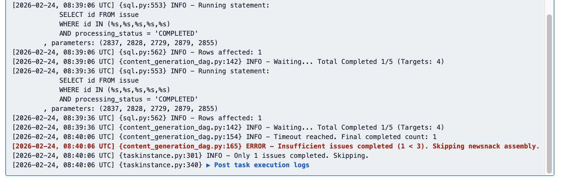 또한, 타임아웃 발생을 선제적으로 방지하기 위해 오래전에 수집됐으나 미처리로 남은 오염 데이터가 선정되지 않도록, 기사 생성 전 최초 이슈 선정 단계에 lookback_hours 조건도 안전망으로 추가했다.