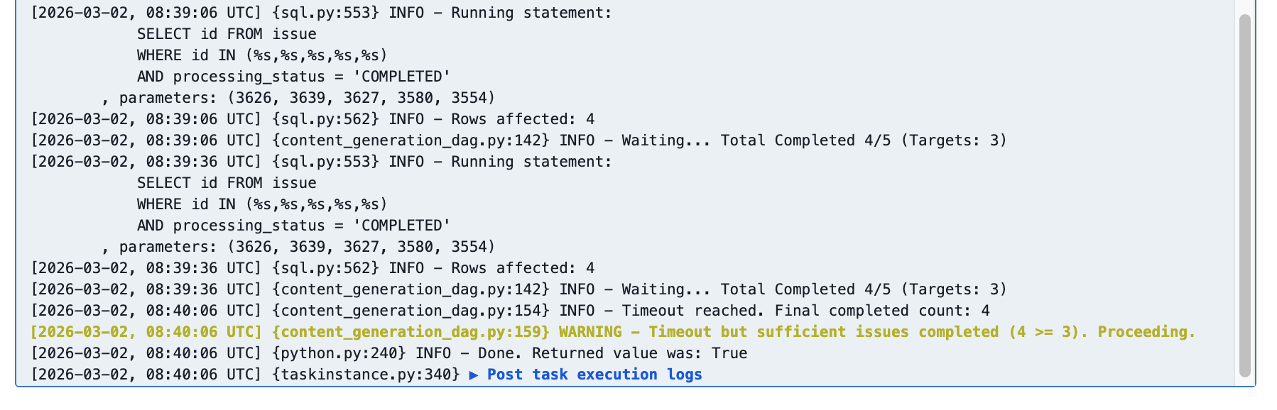 위의 Smart Wait 로직을 통과하면, 결과적으로 타임아웃 시점에 어떤 기사들이 성공적으로 처리되었는지는 오직 관리자인 Airflow만이 알 수 있다.