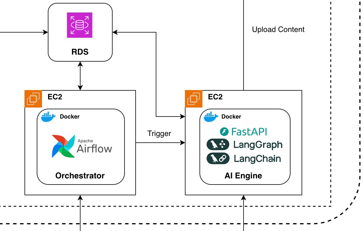 Airflow 도입을 결정하면서 가장 먼저 설계의 원칙을 세웠다. “Airflow는 관리자, FastAPI는 작업자”. 즉 Airflow가 무엇을, 언제 할지 지시하고, FastAPI는 어떻게 AI 콘텐츠를 만들지에만 집중하는 역할 분담이다.