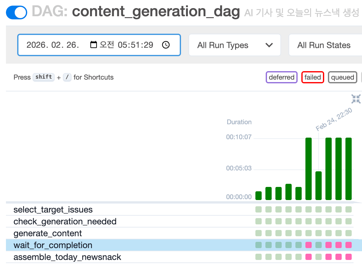 뉴스낵 콘텐츠 생성 DAG의 성공률이 최근 들어 60%로 급감했다. 원인은 우리 서버가 아니라 외부에 있었다. 메인으로 연동 중인 이미지 생성 모델(Gemini 3 Pro Image)이 피크 타임 때마다 과부하로 인해 요청을 거부하고 있었기 때문이다.